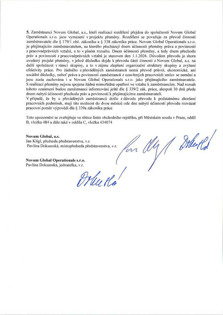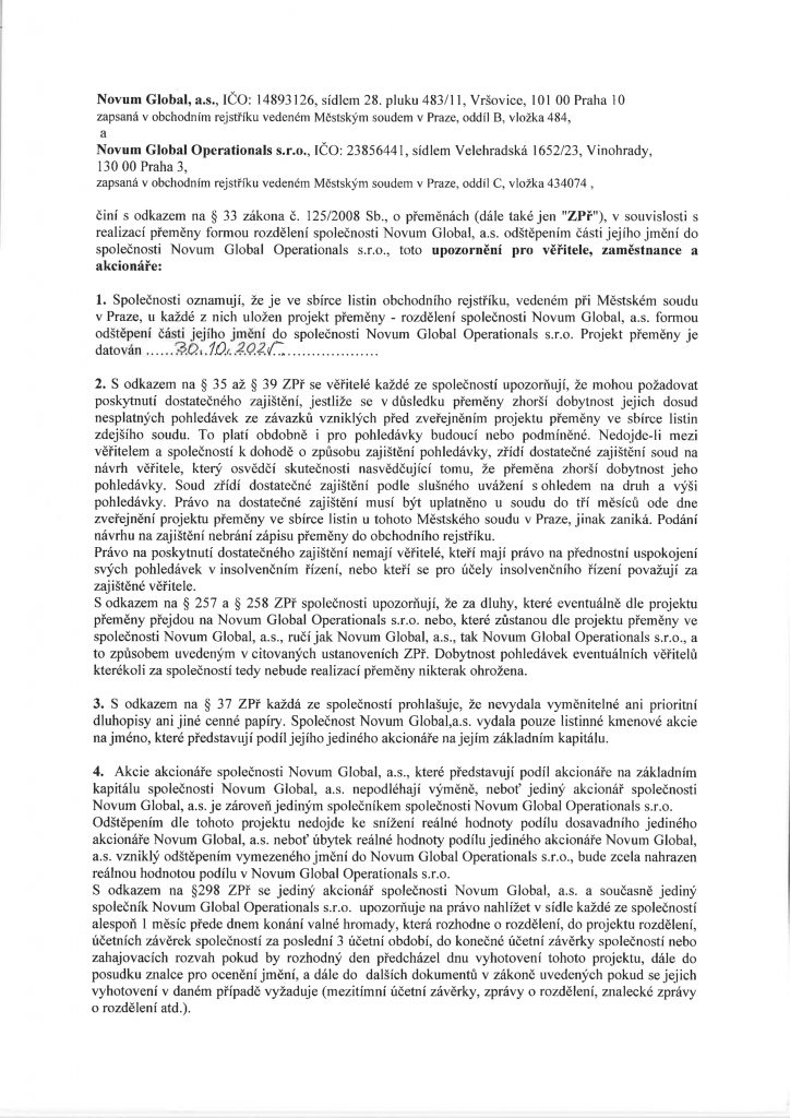 Dne 30. 10. 2025 byla zahájena přeměna společnosti Novum Global formou rozdělení odštěpením dle § 33 zákona o přeměnách. Níže naleznete oficiální upozornění pro věřitele, zaměstnance a akcionáře týkající se realizace této přeměny.